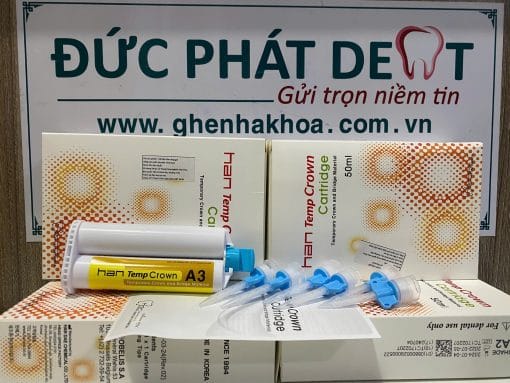 Vật liệu làm răng tạm tỷ lệ 1-1 Han Temp Crown Cartridge cho ra từng mão răng tạm và cầu răng tạm với chất lượng cao, răng tạm cho cả thời gian ngắn hoặc răng tạm trong thời gian dài. Mang tính thẩm mỹ tự nhiên cao trong nha khoa, màu sắc trong mờ tự nhiên, 1 ống có thể làm được 50 đến 60 mão răng tạm
